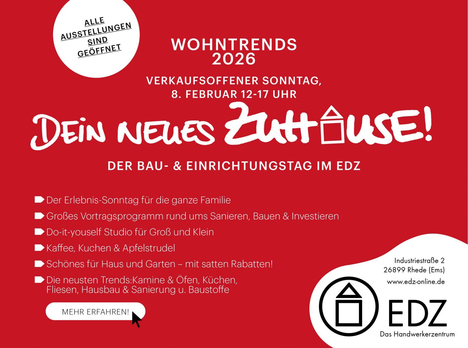 Wohin geht man, wenn man ein Haus bauen oder sanieren möchte? Wo holt man sich Inspirationen und Ideen? So entstand vor über 20 Jahren das „EDZ“, das Ems-Dollart-Zentrum in Rhede (Ems), eine Art Einkaufszentrum für Bauherrinnen und Bauherren, in dem 20 Handwerksbetriebe und Fachanbieter unter einem Dach vereint sind. Hier wird man von Experten beraten, von der Finanzierung bis zur Farbe der Klinkersteine. Im Jahr 2020 wurde das EDZ für sagenhafte 3 Millionen Euro modernisiert und dabei komplett neu erfunden: Heute ist daraus eine einzigartige Erlebnisausstellung mit digitalen Anwendungen und spannenden Verkaufs- und Schauflächen geworden.